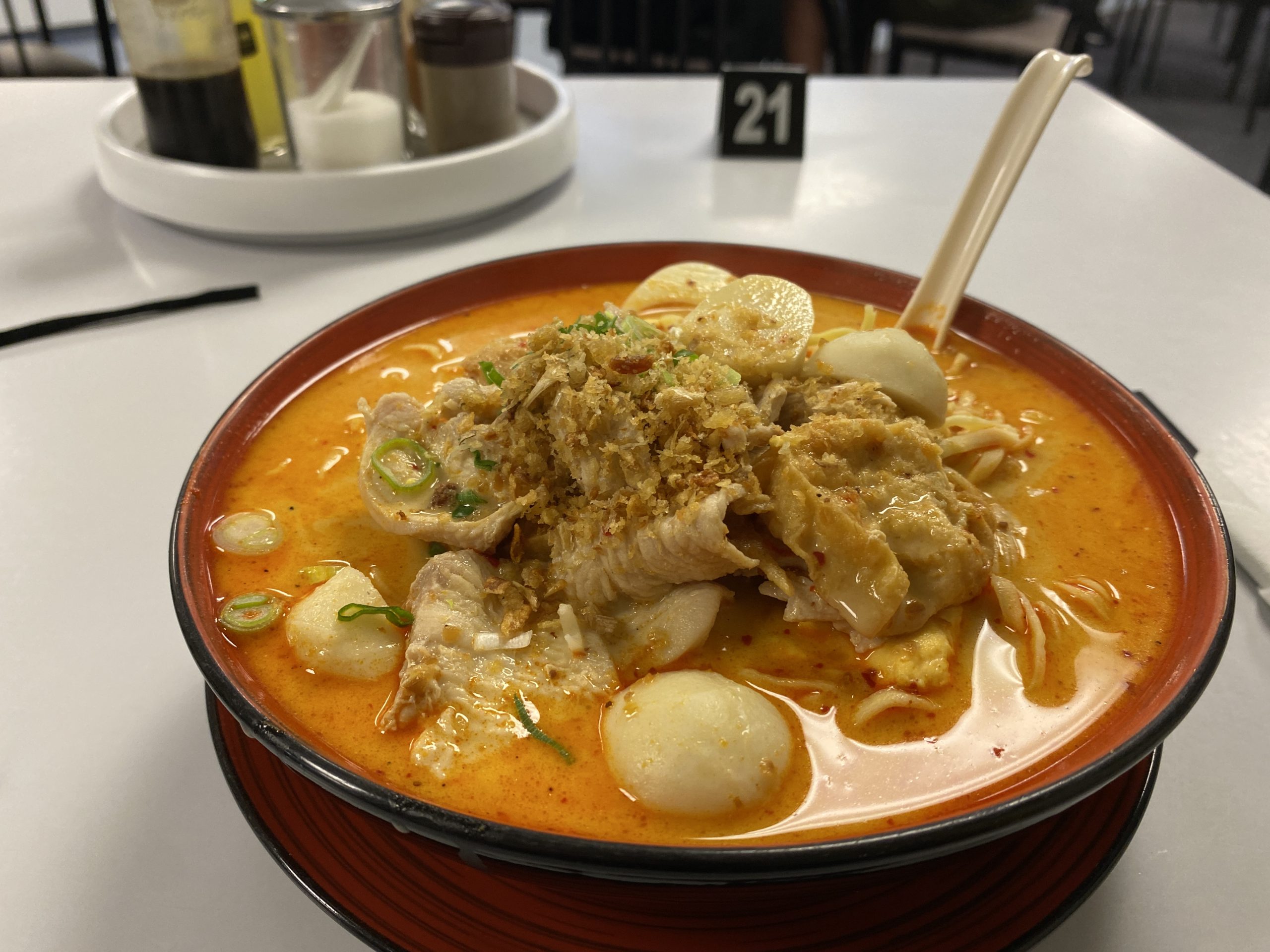 The toppings included fried tofu, chicken, fish balls, and a boiled egg. The noodles had a slightly curly texture, which was my first time experiencing this style in a laksa.