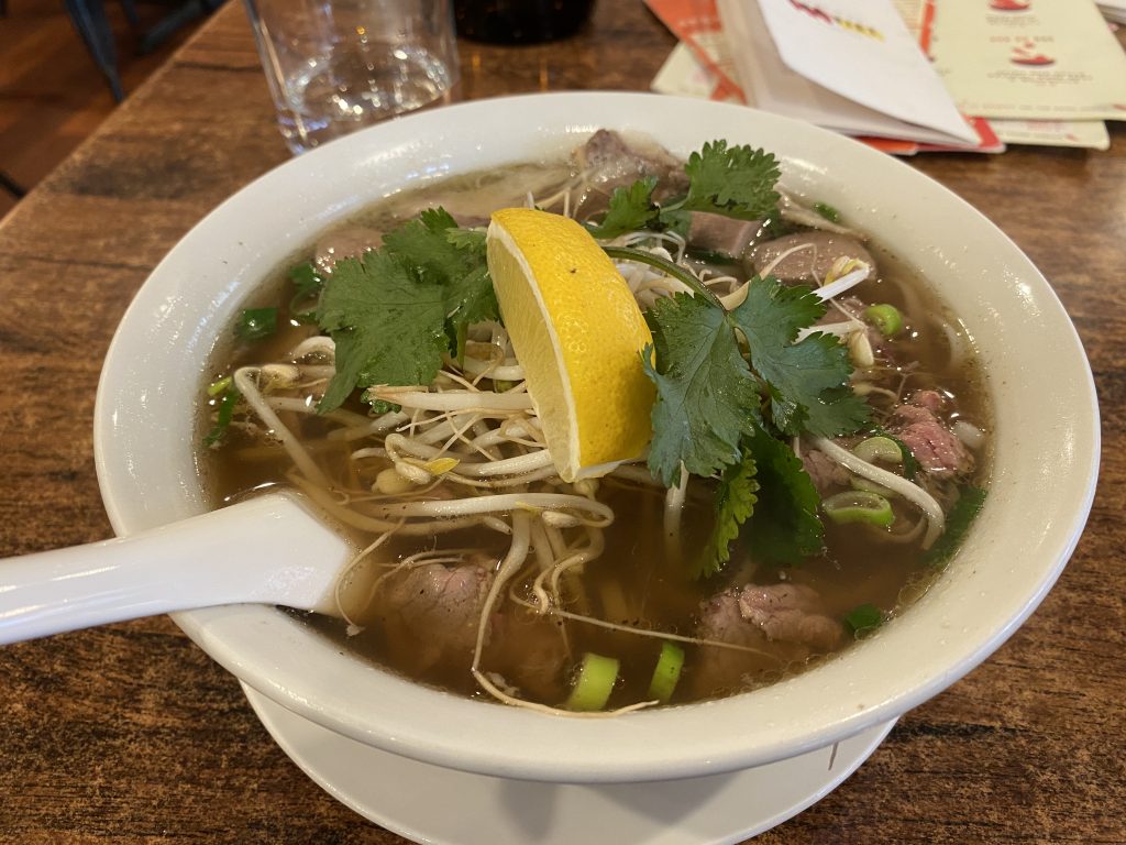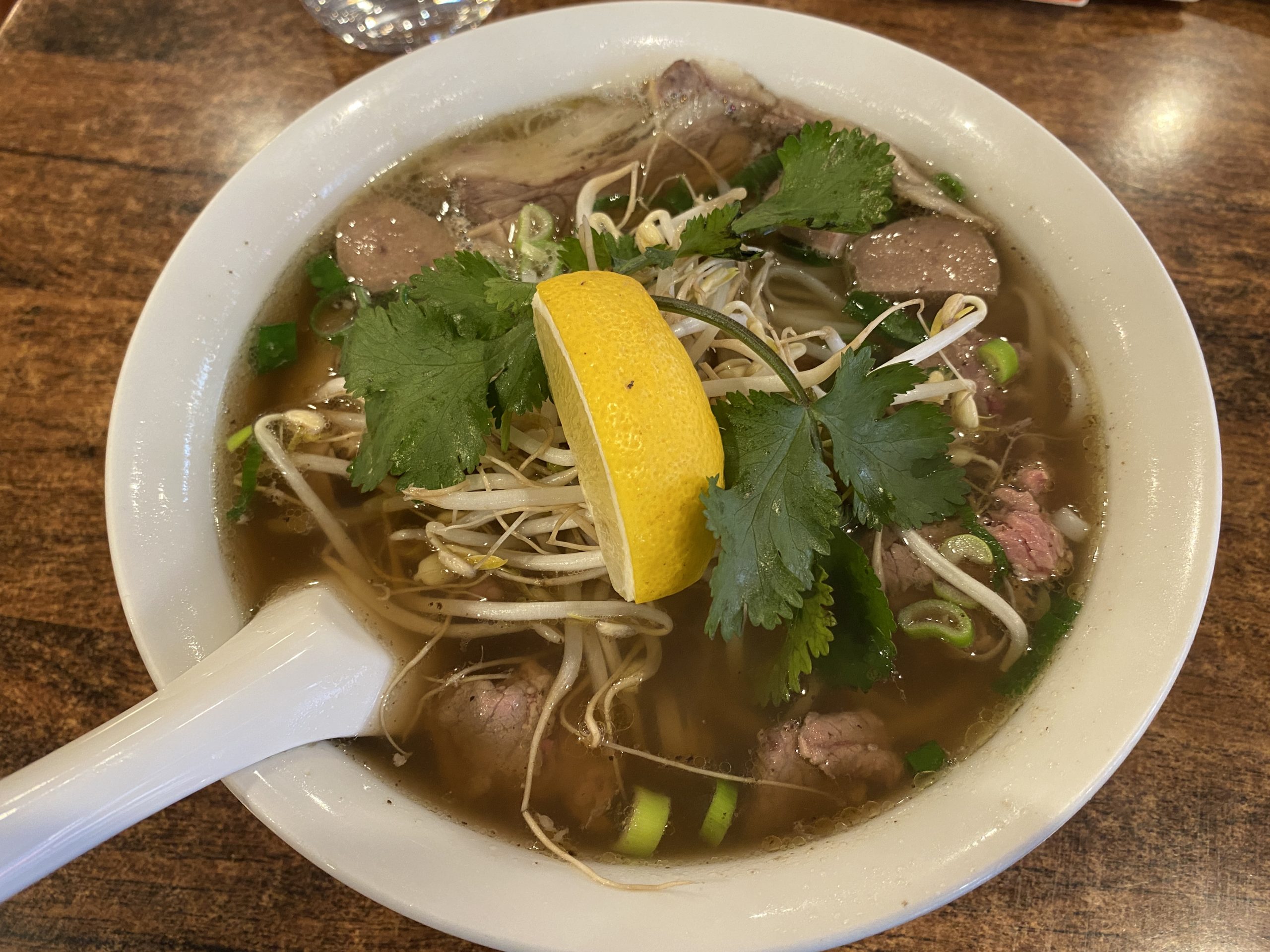 About ten minutes after ordering, the pho arrived at the table, steaming hot. I squeezed the lemon wedge that came with it into the soup. As a side note, in Vietnam it’s more common to use lime rather than lemon, often squeezed using the edge of a spoon.